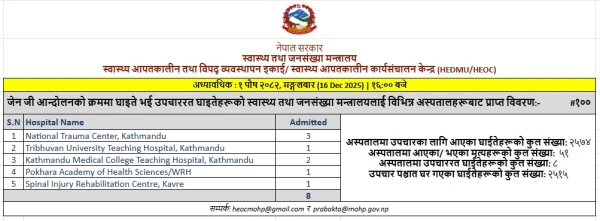जेन जी आन्दोलनको क्रममा घाइते भई उपचाररत घाइतेहरूको स्वास्थ्य तथा जनसंख्या मन्त्रालयलाई विभिन्न अस्पतालहरूबाट प्राप्त विवरण